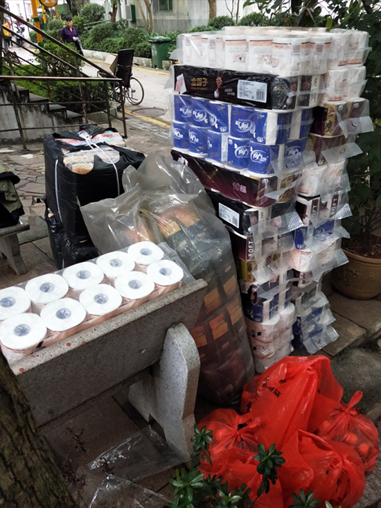 中脈愛心企業捐贈大米、食用油、紙巾、襪子、毛巾等生活用品。