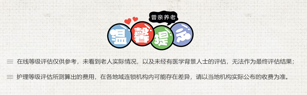 此頁面可評估準備入住普親養老機構長者的初步情況,在每一欄中最能反映其最佳功能狀態的項目所對應的"□"里選擇"ABCD",我們的系統會根據您的選擇,計算出一個大概的評估結論及費用。