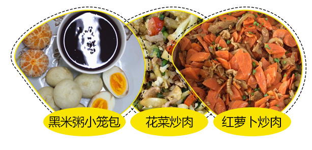 | 晚餐 | 小米南瓜粥 奶香饅頭 木耳炒肉片 油麥菜 絲瓜肉末湯 | 奶香饅頭(1-2個)100g 小米10g 南瓜30g 青椒20g 干木耳10g 油麥菜100g 豬肉25g 絲瓜30g 豬肉10g | 黑米紫薯粥 蔥花卷 清蒸魚 豌豆酸菜肉末 南瓜湯 | 糯米15g 黑米10g 紫薯30g 魚50g 蔥花卷(1-2個) 豌豆30g 酸菜10g 南瓜50g 豬肉25g |