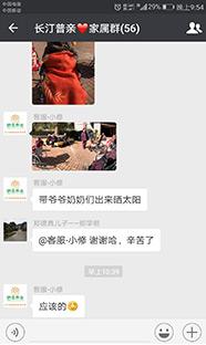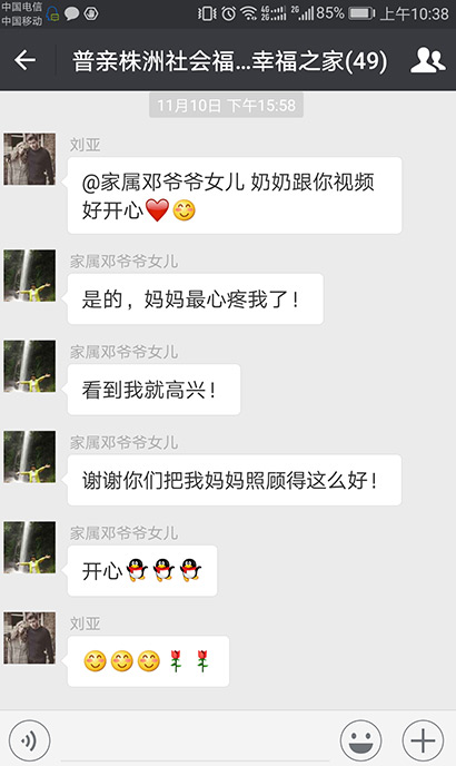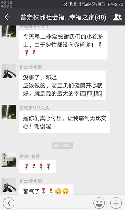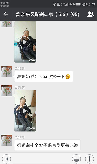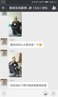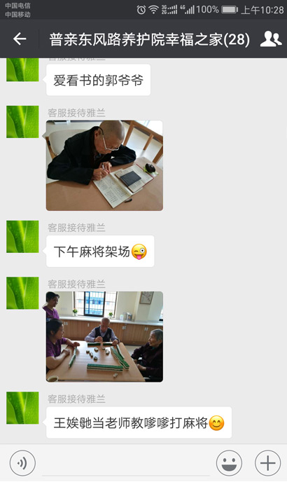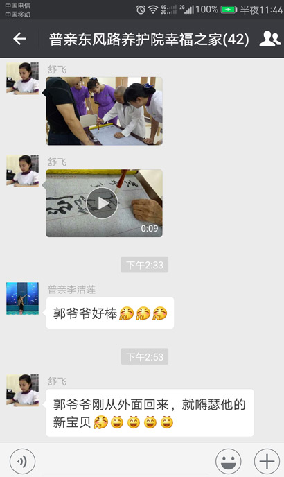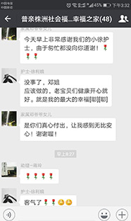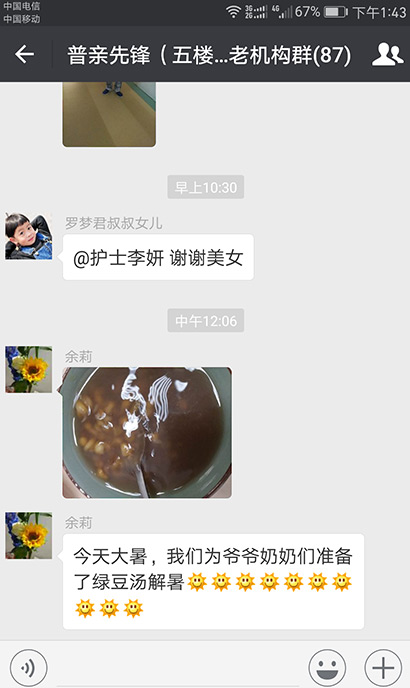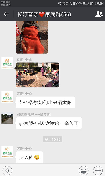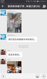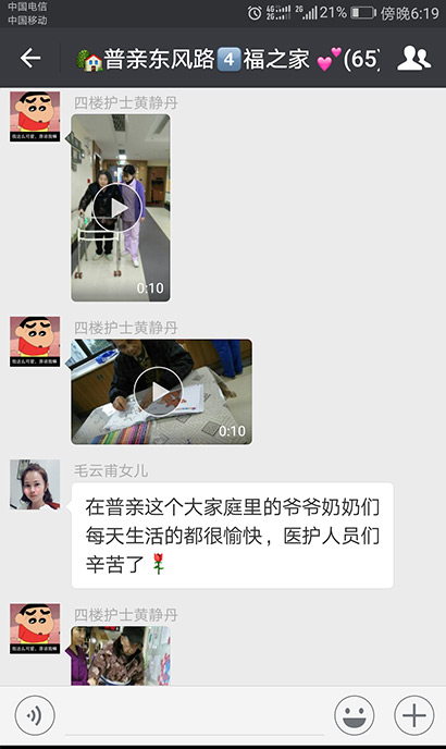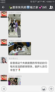 除此之外,普親養老各機構也會為入住老人建立一個包括子女家屬、護工、護士、醫生、康復師等在內的微信家屬溝通交流群,讓子女家屬能夠隨時看到老人在機構的日常生活情況,護理人員也會在群內反饋老人每天的健康狀況,有任何問題都會跟家屬及時溝通。