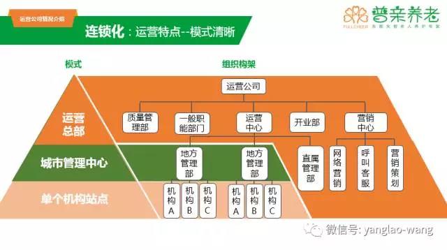 單個機構的設置,管理團隊由站長、站長助理、護理組長組成。廚師和保潔作為后勤支持。整個護理團隊呈蒲公英式分布,老人是蒲公英的花心,圍繞周圍的是一個專業的照顧團隊。