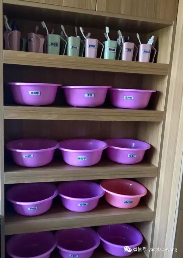 長輩們使用的臉盆、牙刷水杯,同樣整齊收納在一個儲物空間,貼上標簽