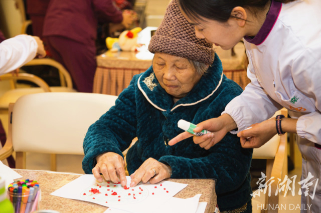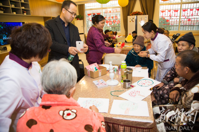 (普親養(yǎng)老機(jī)構(gòu)社工帶著老人在做插畫(huà))