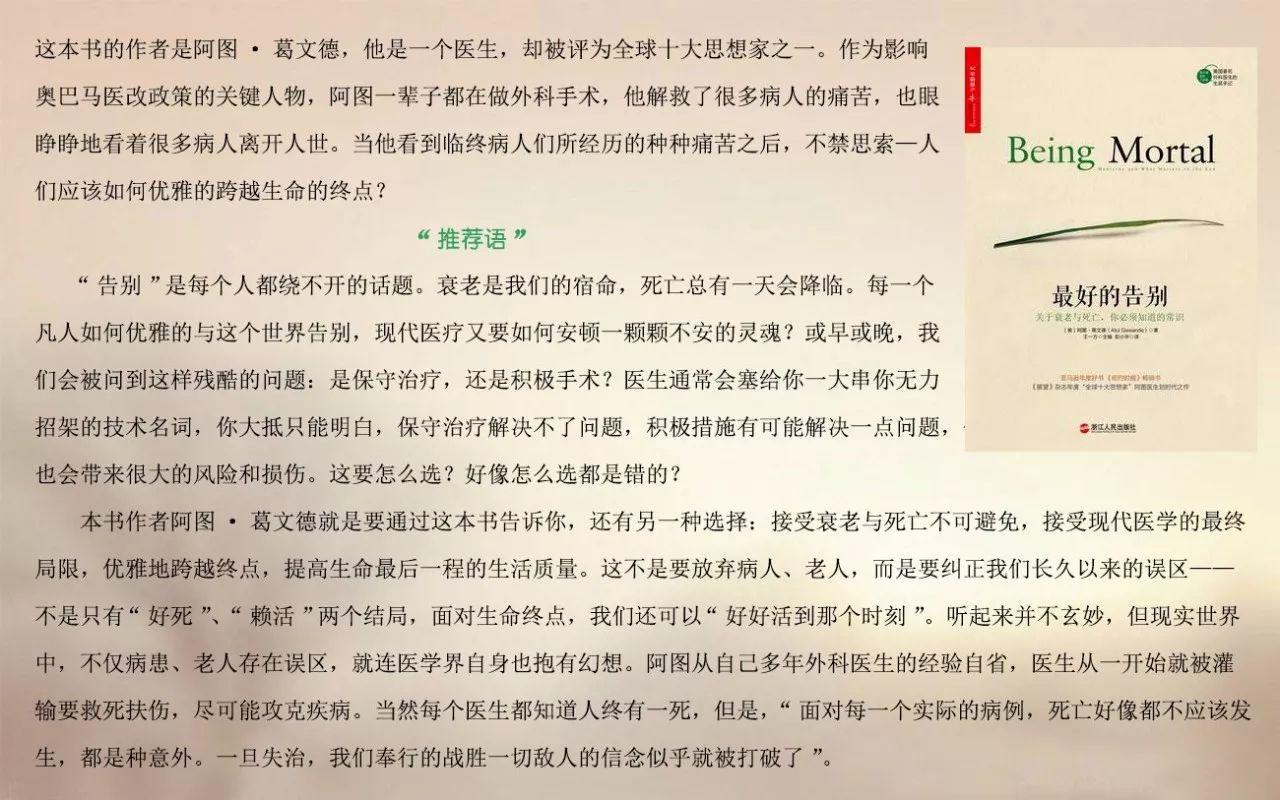 《好的告別》被稱為每個人在50歲前必讀的書,獲譽無數 ,也被奧巴馬選入了2014年感恩節的購書書單。