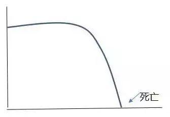 每年在美國有百分之六十的老人因為摔跤而離世。為什么老人的腳會出問題?人老了以后,無法彎腰夠到腳。不洗腳,代表著真正的疏忽和危險。很多老年人上身穿得整齊講究,但脫下鞋,你會發現他的腳很長時間都沒有洗過,生了腳疾。當腳疾被忽略時,如果老人摔一跤的話就很有可能引致死亡。如果把人的健康狀況畫成一條曲線,那么其曲線看起來如圖: