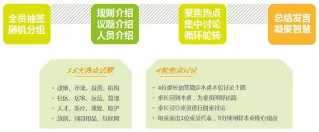 “世界咖啡”養老圓桌論壇,由養老產業資深專家烏丹星與養老產業平臺搭建者周明明共同發起,每期聚焦“養老產業”內的一個熱點、痛點話題,下設數個分議題,一改以往“你講我聽”的被動會議方式,邀請專家、政府相關部門負責人以及資深從業人員作為各議題桌長,在其帶領下,根據每桌不同議題,在有限的時間內,在積極主動友好的討論氛圍中,要求參會者充分發表意見。參與者各桌循環輪換,最后桌長歸納、分享,主持人提煉、總結,最終集結成冊與大家共享。