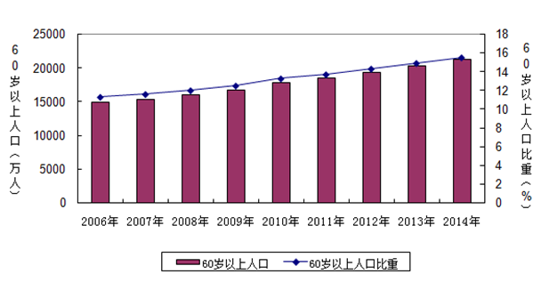 我國《2014年國民經(jīng)濟(jì)和社會發(fā)展統(tǒng)計(jì)公報(bào)》顯示,截至2014年底,全國60歲及以上老年人口約2。12億,占總?cè)丝诘?5.5%,其中65歲及以上人口約1。38億,占總?cè)丝诘?0.1%。