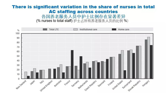 在OECD國家中,養老服務人員護士比例差別是很大的,比如新西蘭的比例就很低,而東歐國家相對比例就比較高。從OECD國家來看,它沒有一個標準的模式,在中國也是一樣,各個地方怎么做差別都是很大的,都是根據自己的條件來做的。