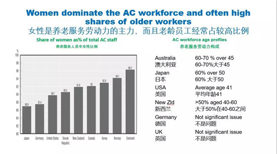 另一個共性問題是:女性是養老服務隊伍的主體,而且老齡員工占較高比例?梢钥吹,德國和英國老齡員工的占比不是那么高,但是其他國家女性比例比較大,而且年齡比較大,跟中國類似。
