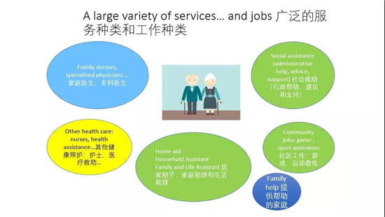 下面介紹法國案例。從法國來看,養老服務業的職業種類非常多,不單純就是護理崗位,因為養老照護涉及的面非常大,牽涉到的工作性質和工作種類是非常復雜的。法國有一系列培訓方面的安排,有一個專業化的訓練,而且是把培訓與就業直接聯系起來。
