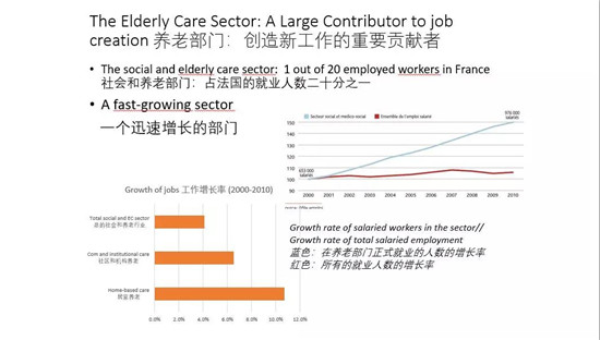 從法國來看,整個養老部門的就業占到全國就業的1/20,而且隨著老齡化的加深這個數字增長很快,是一個直線上升的態勢,而全國的就業增長是一個平穩的趨勢,養老部門是迅速增長的部門。養老部門是創造新工作的重要貢獻者,因此要特別重視養老部門就業。關鍵是如何把人吸引進來,讓照護人員隊伍穩定,滿足老年人的養老服務需要。