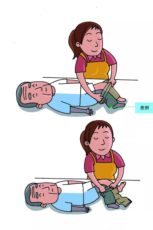 1)將褲管卷起,套進(jìn)患側(cè)腿部,健側(cè)也同樣進(jìn)行;