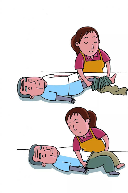 1)讓老人彎曲膝蓋,將手放在腰下使身體懸浮,再將褲子拉下直至膝部;
