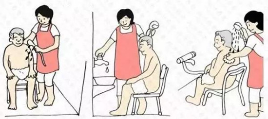 1)扶入浴室:征得老人同意后,攙扶(或用輪椅運送)老人穿著防滑拖鞋進入浴室。