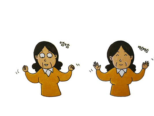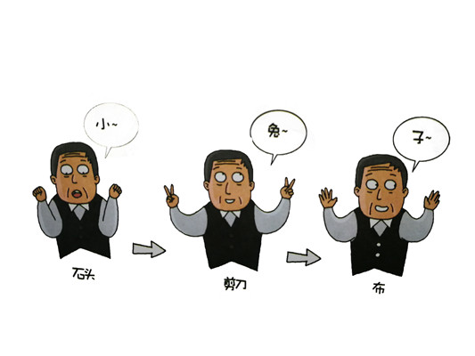 不僅是手,身子也一起擺動起來,石頭(將身子蜷縮起來),剪刀(兩手向前伸出),布(做出萬歲的動作)。