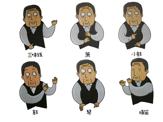 ①隨著音樂,做出樂器發(fā)出聲音的模仿動作。