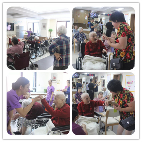 長者們正在護理員的帶領下做健身操,養老機構院長們也加入了健身操的隊伍,和入住長者進行了熱烈的互動。