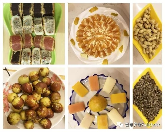 在山東濟南,普親養老早就已經備好各種瓜果點心,室內也早已妝點一新,節日氛圍濃厚。
