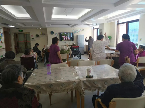 此時正值上午,養護院呈現出一派舒適景象:富有特色的環創設計,干凈整潔的長者居室,沒有異味的洗漱間和衛浴間,和煦的陽光照進活動室,不少長者在護理員的帶領下正在做操。精神奕奕、有說有笑的長者給調研團留下了深刻印象。