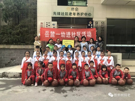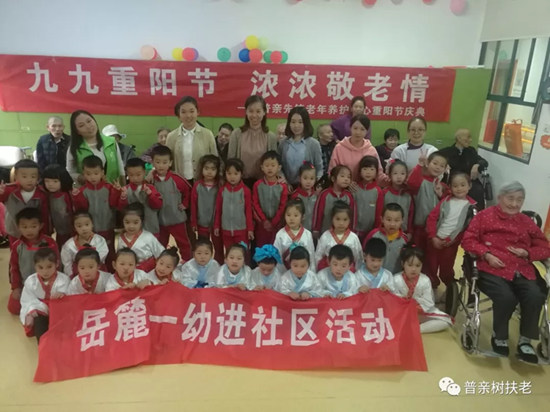 時值敬老月,普親先鋒社區老年養護中心與岳麓一幼師生一起為社區的老人慶祝重陽節。