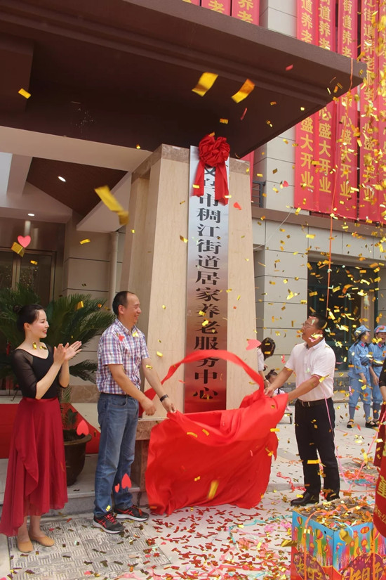 義烏市政府副市長朱有清、金華市民政局副局長胡立中、義烏市民政局局長劉德鈞、稠江街道辦事處書記江澤陽共同為養(yǎng)護中心揭牌。