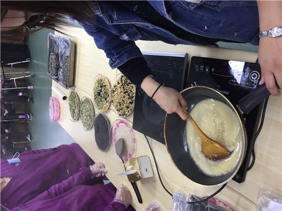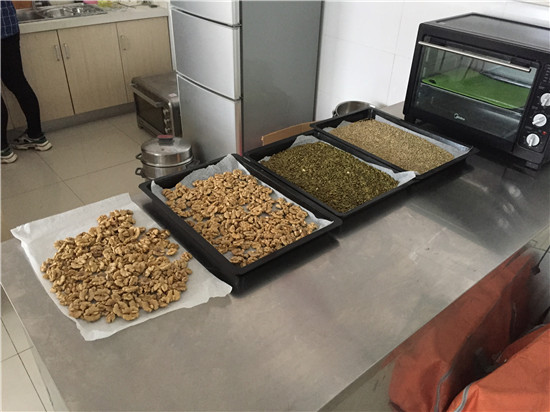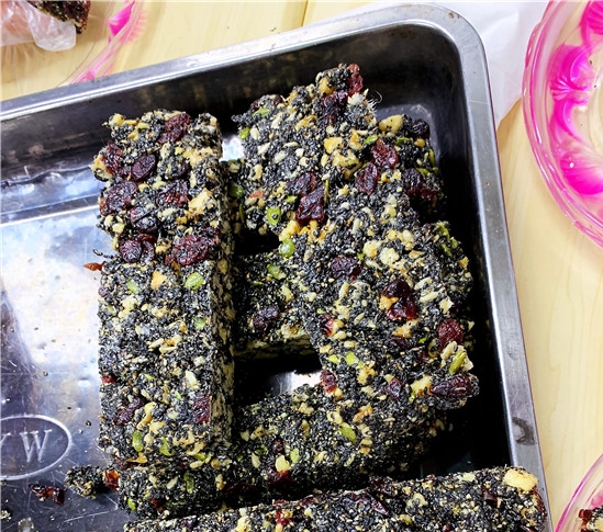 原材料都是工作人員早已準備好的食材,烤熟的核桃、芝麻、瓜子仁和蔓越莓香氣四溢,熬煮的麥芽糖讓整個活動大廳都充滿甜蜜的香味。
