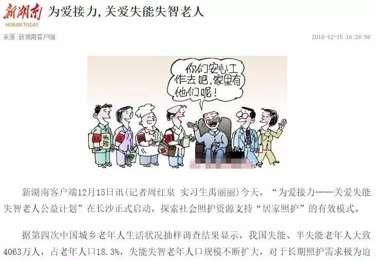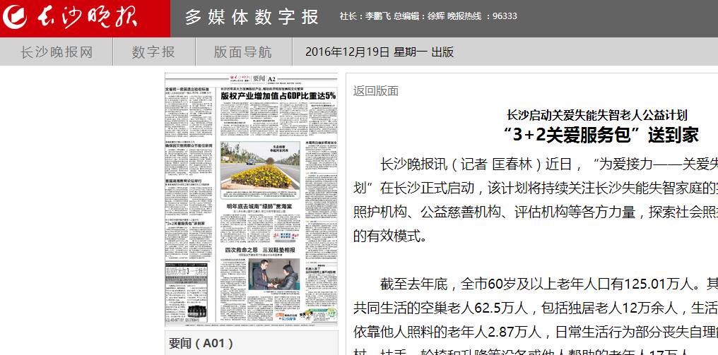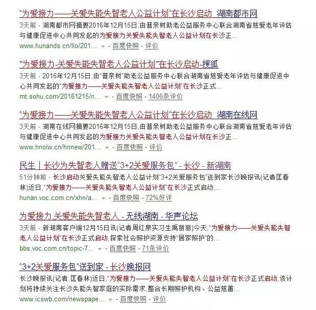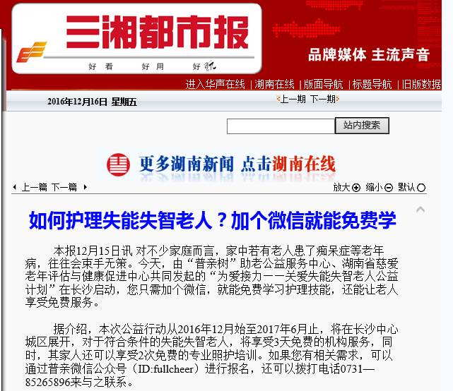 此外包括快樂老年報、紅網、搜狐、湖南都市網、湖南在線網等媒體紛紛對“關愛失能失智老人公益計劃”進行了報道。