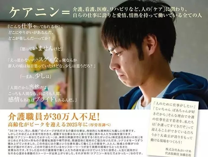 這部電影作品取材于日本30余所介護福祉機構、專業學校、相關團體等。用娓娓道來的方式,闡釋了介護這份工作的意義,傳遞了人與人之間的感情。全面生動地展現了介護工作中的各種場景,以及工作人員的相互配合和對長者的尊重。