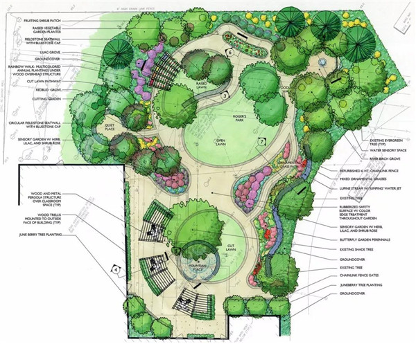 花園的選址及空間布局要便于長者尋找,在通往花園的道路上不應存在任何阻礙物。其次,花園盡量選擇一個安全的環境,設立無障礙通道,沒有陡峭的坡道。在花園規劃設計前期,需考慮一系列會影響到長者行動的問題,避免長者身在其中卻感到被囚禁與壓迫感。