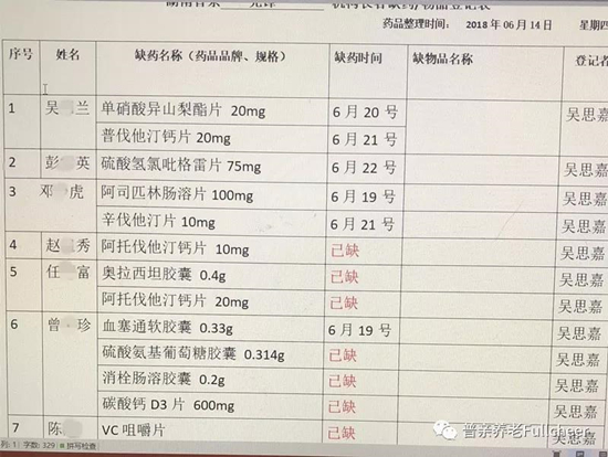 ▲▲▲這是普親養(yǎng)老某機構(gòu)6月某周的老人缺藥清單。