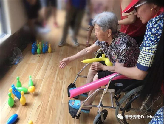 打保齡球不用去高端會所,在普親養老院就能玩。距離更短,球更輕,自由選擇球道,爺爺奶奶們打出來的成績也更好。看,奶奶上場投球,本以為沒打到,結果運氣好,全中啦!