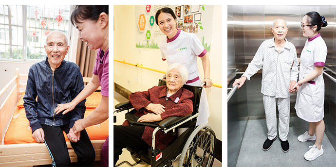由經驗豐富的醫生、護士、營養師、護理員、廚師、康復師等組成的專業團隊,嚴格按照1:3的照護比例,為入住老人提供完善的起居照顧、護理服務、膳食服務、康復照顧、醫療保健、精神慰藉、喘息服務等方面的長期照護服務。