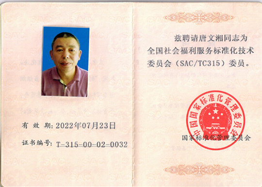 湖南普親老齡產業發展有限公司董事長唐文湘先生,被聘請為全國社會福利服務標準化技術委員會委員。