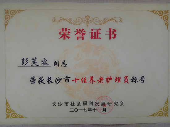 長沙普親老年養護院院長彭芙蓉女士,榮獲長沙市十佳養老護理員稱號。