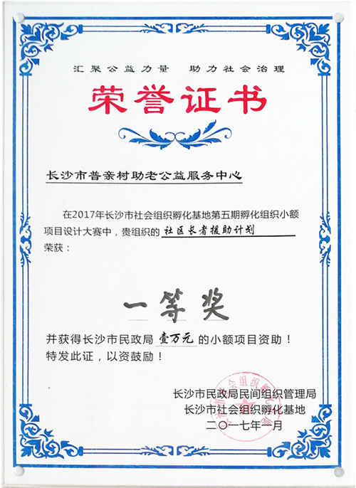 長沙市普親樹助老公益服務中心的社區長者援助計劃,榮獲長沙市社會組織孵化基地項目設計大賽一等獎。