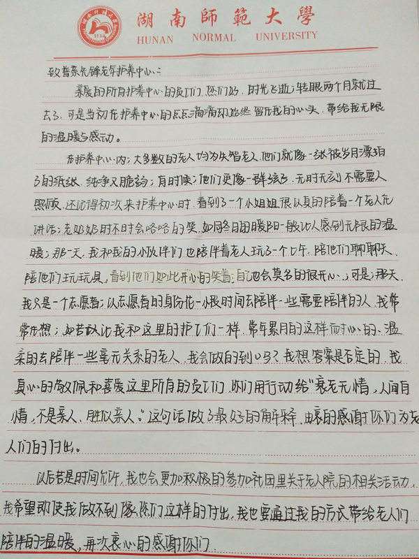 湖南師范大學志愿者在參加湖南普親老年養(yǎng)護中心先鋒機構(gòu)志愿服務(wù)后感言!
